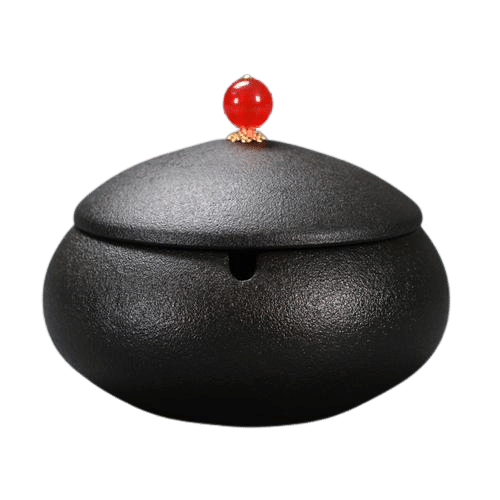 L’ingénierie du cendrier Bisma se manifeste dans chaque détail. La texture granuleuse confère à la céramique des propriétés mécaniques et visuelles spécifiques. Le système de préhension du couvercle intègre un marqueur visuel distinctif : un cabochon rouge vif de type gemme, serti dans une monture dorée. Cet élément n’a pas qu’une fonction décorative ; il agit comme un point de repère ergonomique et atteste du soin apporté aux finitions, une norme de qualité chez Cendrier original. Le produit final est un système complet, conçu pour allier performance, fiabilité et esthétique technique.