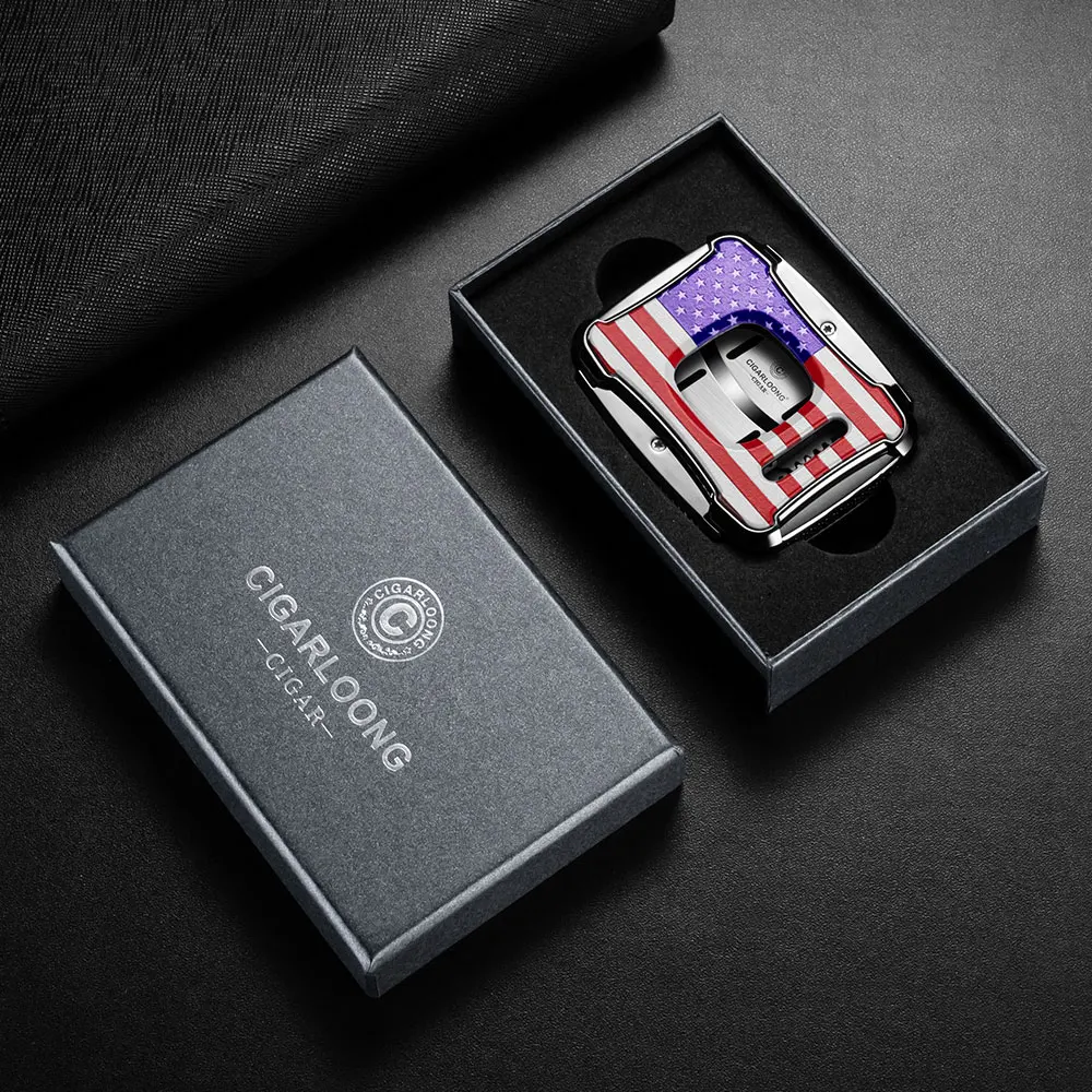 L’esthétique de ce coupe-cigare découle directement de sa conception rigoureuse. Le corps en métal à finition chromée brillante sert d’écrin au motif du drapeau des États-Unis, appliqué avec une grande fidélité. Un insert ovale en acier brossé, où est gravée la marque CIGARLOONG, apporte une nuance de texture et atteste de la qualité des finitions. Chaque composant est pensé pour sa fonction et sa durabilité, résultant en un objet à l’équilibre parfait entre performance et design.